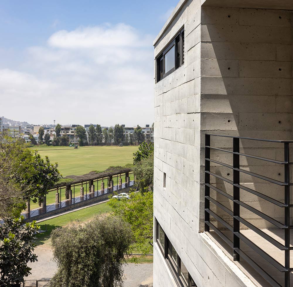 Vista al espectacular verde del Lima Polo Club. Lima Polo 375 representa la primera colaboración entre Morada y uno de los arquitectos más emblemáticos e influyentes de la escena arquitectónica peruana, Guillermo Málaga.